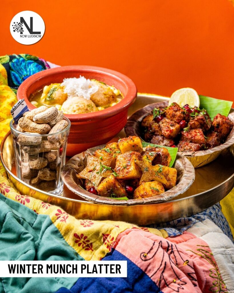 The menu opens with the Winter Munch Platter, featuring Kaanji Vada, Aloo Chaat, Kamrak Shakarkandi Chaat and crunchy peanuts, with an optional vodka add-on for an extra winter kick.