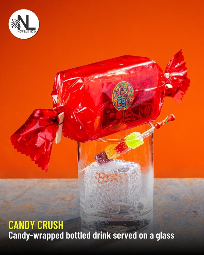 Candy Crush: It’s giving sweet, it’s giving wild. A candy-wrapped bottle presented on a glass!