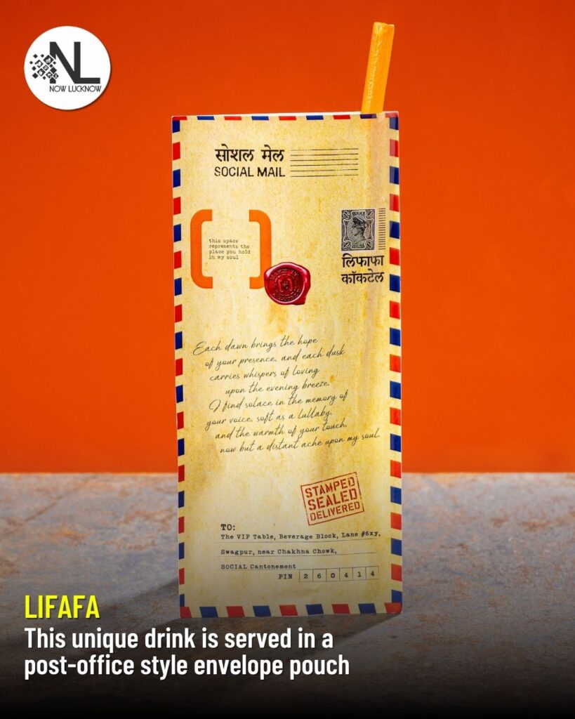 Lifafa: A drink served in a post-office-style envelope pouch, Lifafa is a nod to brown paper bags and hidden sips, now dressed up in SOCIAL style.
